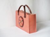 全て手縫いです。イタリア革「ブッテーロ」を使って作りました。使うほどに艶と深みを増し、最高級のカバンとして永年使うことができます。表の模様は『象嵌』(ぞうがん)と言う工芸的技法で、革をはめ込んだものです。そのはめ込んだ革を、さらに本体に縫い付けてあるので、少し盛り上がった感じです。