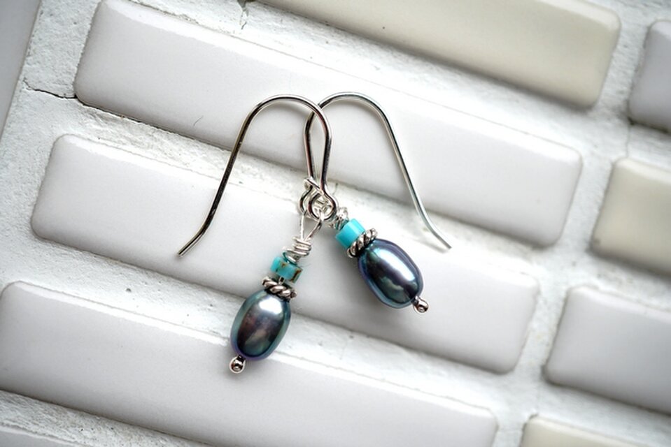 左右のパールのお色も微妙(はっきり?)違って楽しいです。ターコイズとの相性も意外といいですよね。カジュアルなTシャツにもお似合いです。勿論ちょっとフォーマルなお席にも是非お付けくださいませ♪パールはオールマイティーなアイテムですね。