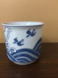磁器の素焼き素地に、呉須と呼ばれるブルーの顔料で絵付けをした後、透明釉をかけ、1250度で本焼きしています。
