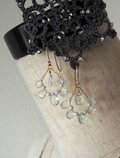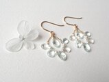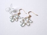 水のように透明で極淡い水色のアクアマリンと清楚なパールを連ねたピアスで、アクアマリンは特有のクラックがところどころ入っていますが、水の泡のように完全に透き通らず、きらめきと天然石らしさが出て綺麗です。大きさを変えた5石の間に清楚なパールをはさみ、真ん中にも一粒アクアマリンの雫をぶら下げました。動く度に揺れてきらめく、清楚で涼し気なピアスです。
