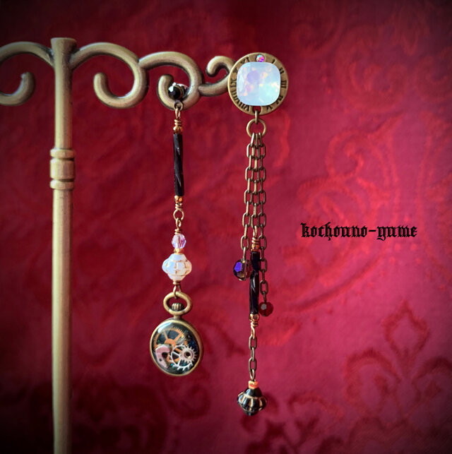 長めの揺れるスチームパンク風アシンメトリーピアスです。