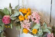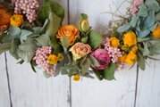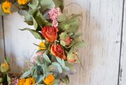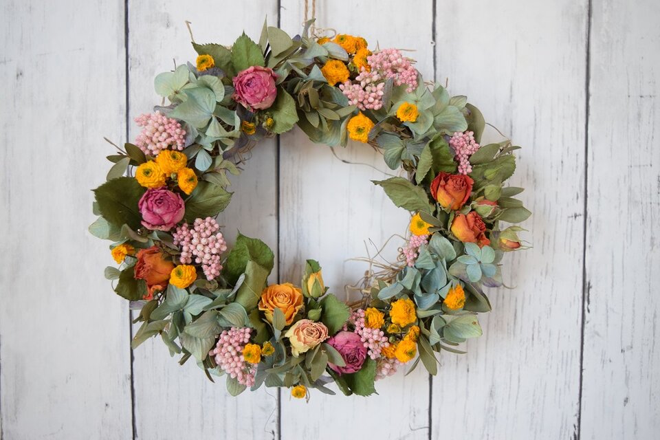 グリーンの葉から見え隠れするオレンジ色のミニバラは、元気がもらえるビタミンカラーです。ブルーのアジサイとピンクのライスフラワーを加えて…爽やかな初夏を思わせるリースになりました。