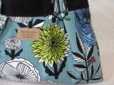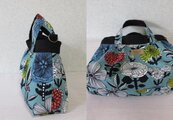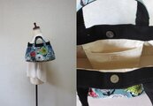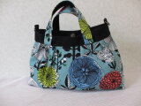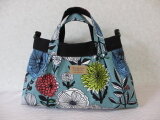 青磁色のベース地に鮮やかな花柄が人目をひく生地で横長トートを作製しました。