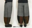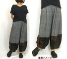 ウエストは総ゴムのフリーサイズ、共布紐が付いているので微調整出来ます。渡り幅も膝回りもゆったりしているので履き心地はとても楽です。股上も前後平均で39cm、背の小柄な方でも可愛いらしく着こなせる総丈87mです。