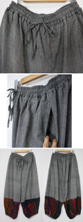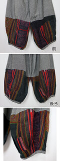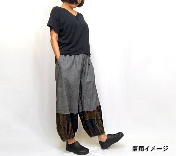 人気のもんぺパンツに美しいモン族の刺繍をあしらった新作です。無地のタイ手織り綿に渋い手刺繍やろうけつ染めが映えてとても可愛いです。パンツの色目は黒X白の織りでグレーのシックな色合いです。
