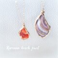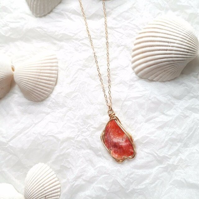 海辺の宝石、鮮やかな赤のシェルネックレスです。美しいシェルのかけらをゴールドで大切に包んで仕上げています。 ゴールドでラッピングする事で華やかさが増し鮮やかな色や模様がより引き立ちます。 また、繊細な素材ですので強度も増します。