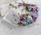 様々な色と形のアジサイをぎっしりと入れ、花かご風のリースにしてみました。この季節限定のリースです。アジサイの紫〜ブルー〜ホワイトの色のグラデーションをお楽しみください。また、バイモユリとも呼ばれているフレチラリアと白の小菊をアクセントに入れ変化をつけました。そしてちょっとあばれた小枝でナチュラル感を出してみました。壁掛け用として作っていますが、ウエディングのお色直しの小振りなリースブーケとしてもご利用いただけると思います。
