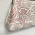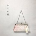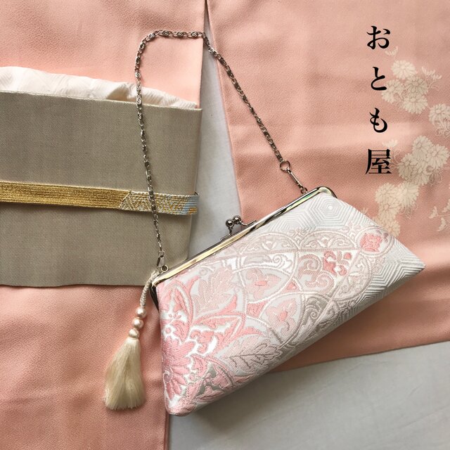 絹帯 2way がま口クラッチバッグ 白×ピンク タッセル、チェーン付き