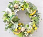 リース素材:アーティフィシャルフラワ-(造花):スライスレモン・スライスライム・ベリー・ユーカリ・ホップ・小花・スイトピー・白い実、など。自然素材:アンバーバーム、など。