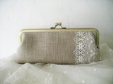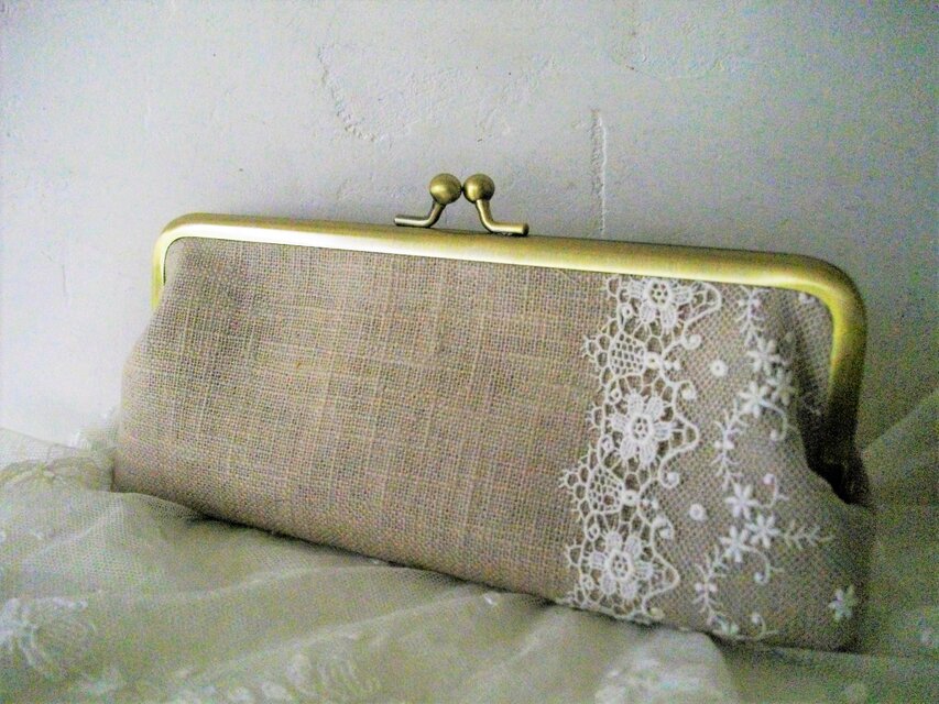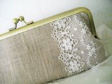エクリュリネンに刺繍アンティークチュールレースをのせたがま口ペンケース