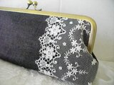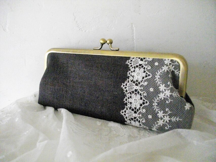 シックな色合いのパープルリネンに刺繍アンティークチュールレースをのせたがま口ペンケース
