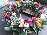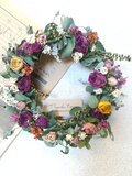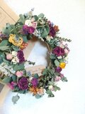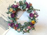 ばら、カーネーション、タタリカ、マーガレットなどをアレンジしたユーカリがほのかに香るナチュラルなリースです。