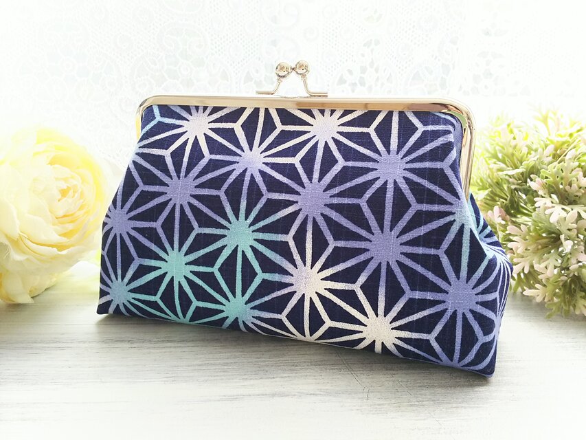 ◆【売り切れ】【再販4】モダン麻の葉柄がま口ポーチ紺色*和柄和服着物浴衣日本がま口バッグさわやか旅行