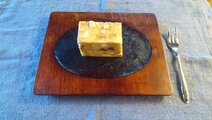 ほぼ四角のイチョウの板の中央に楕円のノミ跡を残した皿です。