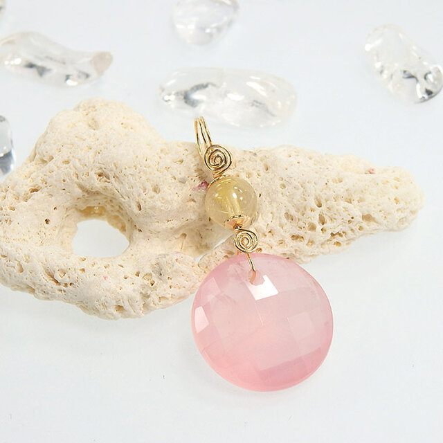 ラウンドカットのローズクォーツとルチルクォーツを、K14GFのワイヤーでシンプルなペンダントに仕上げました。