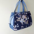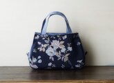 生 地:表地:ネービー花柄のソフト綿麻キャンブリック、リエン55%、綿45%(国産)、 ドライグレー色の帆布11号、綿100%(国産)、セルリアンブルーの帆布11号、綿100%(国産)