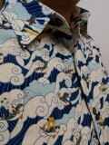 綿麻生地に波に猫サーフィンが描かれた粋可愛いシャツ