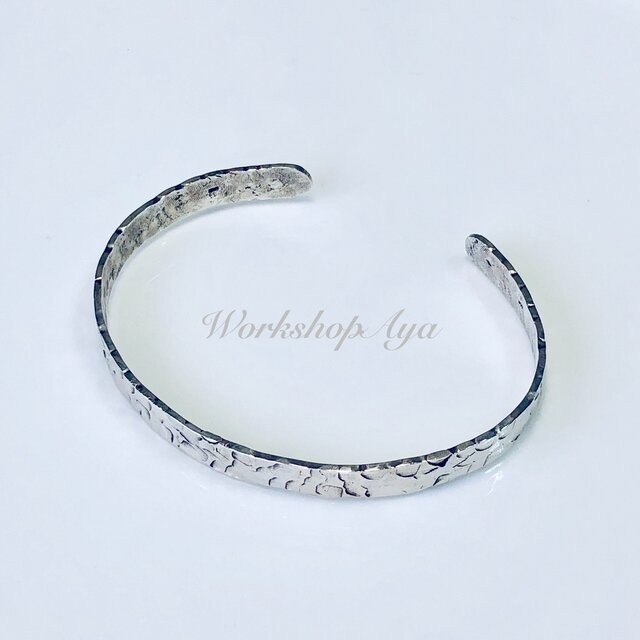 上質なシルバー950の板を槌で叩いて伸ばし、シンプルでおしゃれなバングルに仕立てました。