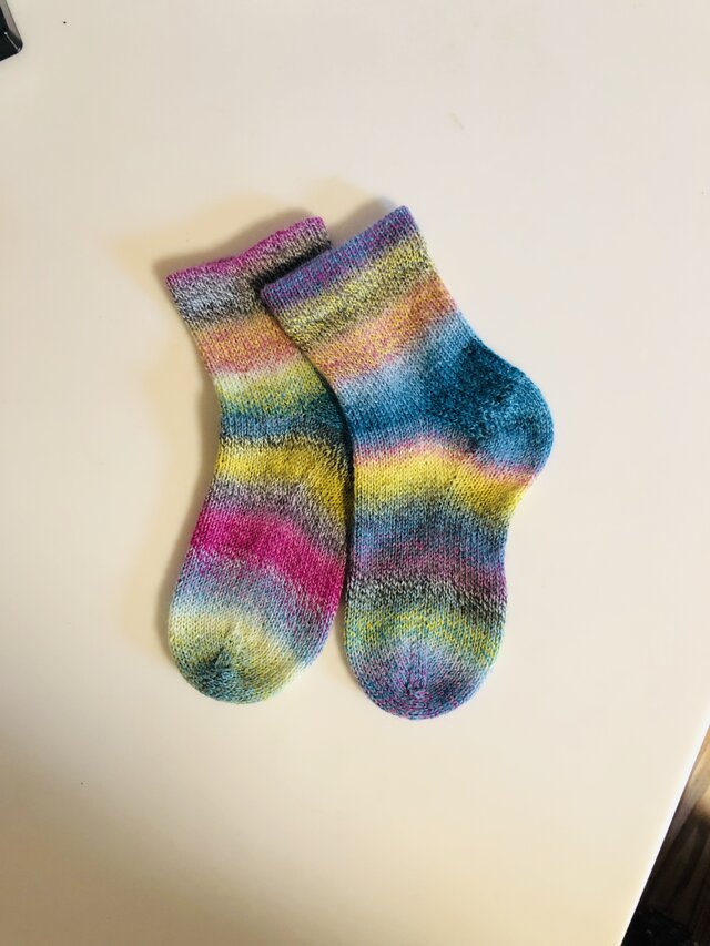 ちなみに竹串か?!ってくらい細い針で編んでるので意外と薄いです。普通の靴下と同じように履けますよ♪