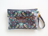 リバティの人気生地、(ビニールコーティングつや無)、Strawbery Thief ストロベリーシーフ(ブラウン)で開けなくても中身が見える便利なポケット仕切り入り、クリアポーチ(Sサイズ)を作りました。