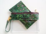 リバティの人気生地、(ビニールコーティングつや無)、デビッドジョー David Joe(グリーン)で開けなくても中身が見える便利なポケット仕切り入り、クリアポーチ(Sサイズ)を作りました。