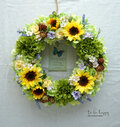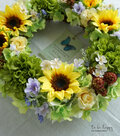 ヒマワリをメインに、グリーンのダリアやアジサイ、