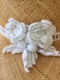 レース糸で編んだ花、木の実、葉を組み合わせたブローチとリボンのセットです。