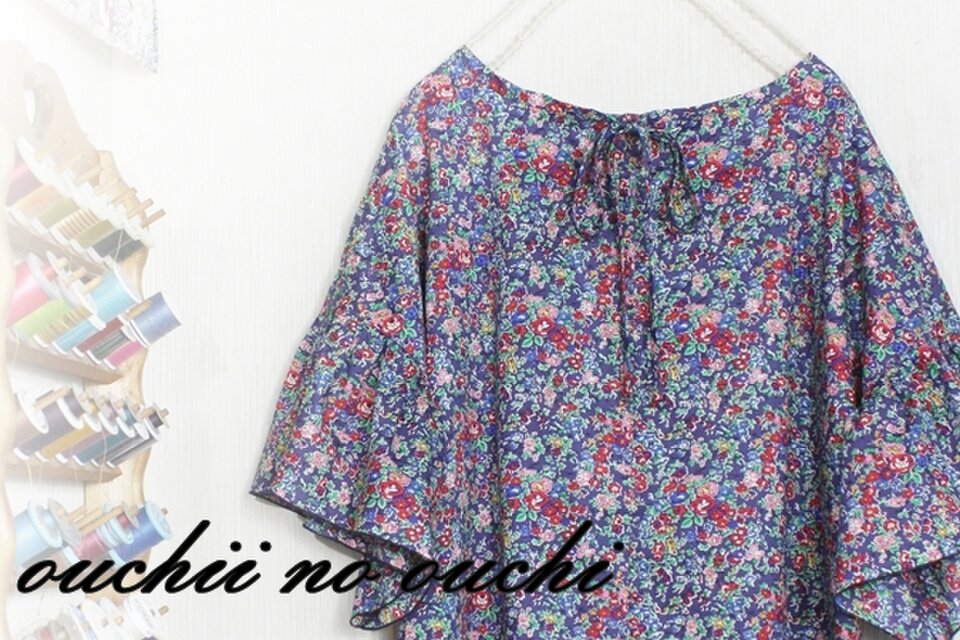 大人気柄リバティ国産タナローンの大人気柄Tatumテイタム ネイビー×レッド系でギャザースリーブのフレンチブラウスを作りました。ヒップの隠れるロングタイプで身幅も若干大きく着用しやすくしています。お袖は巻きロック仕上げにしています。