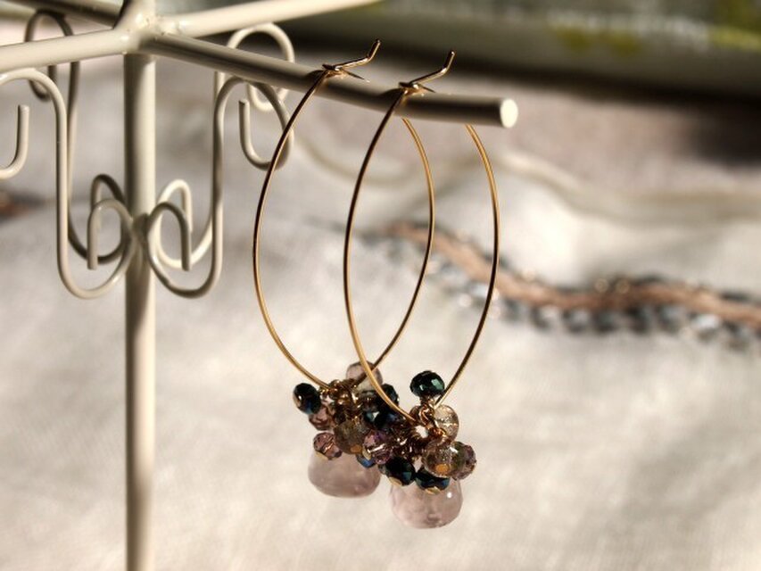 ローズクォーツとチェコビーズのチャームをつけた、オリーブ型のフープピアスです。
