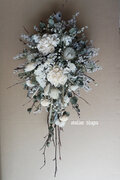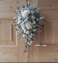 白樺小枝を束ねたベースに、ソラダリア、シルバーデージー、スターチス、かすみ草、タタリカ、ヤマハハコなどを集めて清楚な壁掛けを作りました。