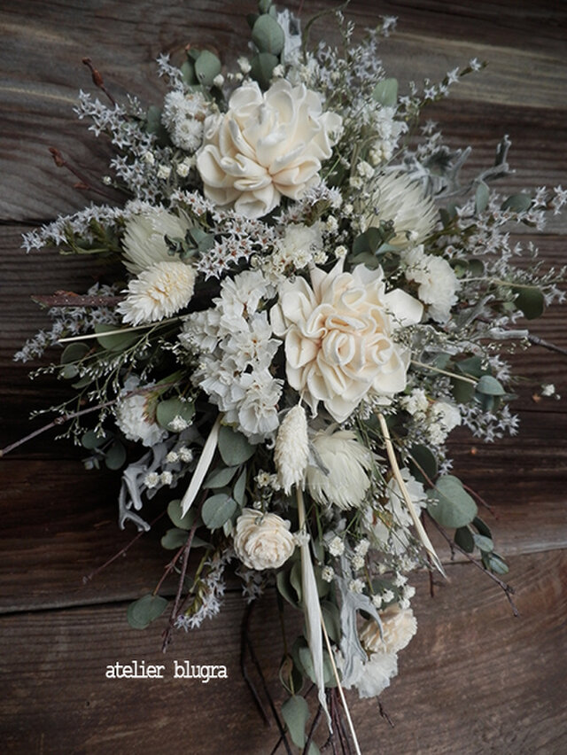 使用材料 ソラダリア、シルバーデージー、かすみ草、タタリカ、スターチス、ヤマハハコなど。