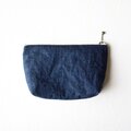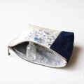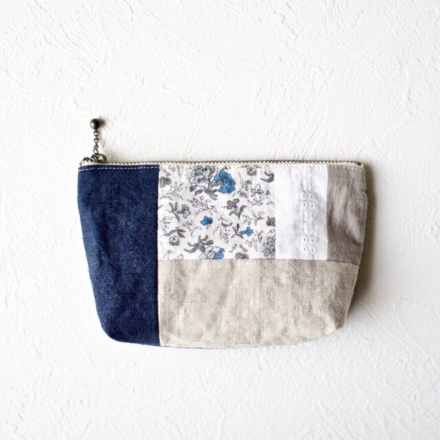 深い紺色の麻デニムとコットンの花柄生地をポイントにコットンのレース生地、リネンなどいろいろな生地をパッチしたポーチ。