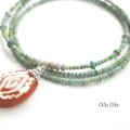 そして珍しい文様の超希少石・エッチドカーネリアン。非常に入手困難なこの古代とんぼ玉の起源は、今から3600年~4600年前のインダス文明期にまで遡るといわれており、植物から採取したナトロンと呼ばれる天然ソーダでカーネリアン(紅玉随)の表面に文様を描き、300℃~400℃の低温で焼成することにより文様を白化させカーネリアンに定着させます。