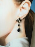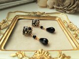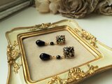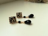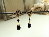 *内側にゴールド色のガラス片が入ったスクエア型のカボションを透かしに乗せ、黒ビーズを2種類下げました。