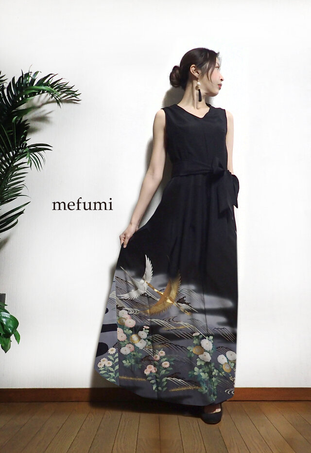 繊細で美しく、上品で艶やかな鶴と華々が奏で長れる、素敵なアンティーク着物をほどいて、画像デザインのフォーマルワンピースをお作りいたします。