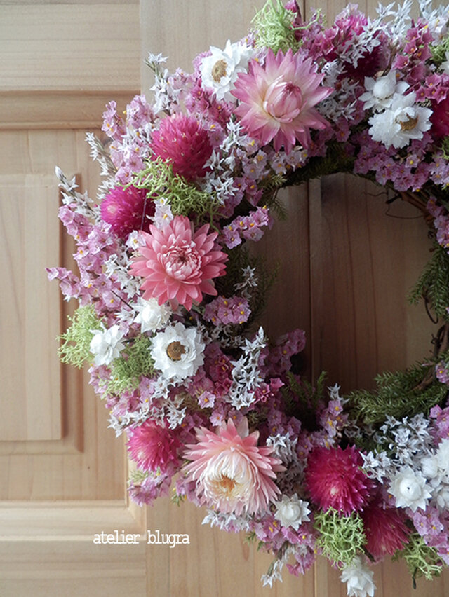 使用材料 サマーチェリー、貝細工、タタリカ、アンモビウム、センニチコウなど。