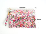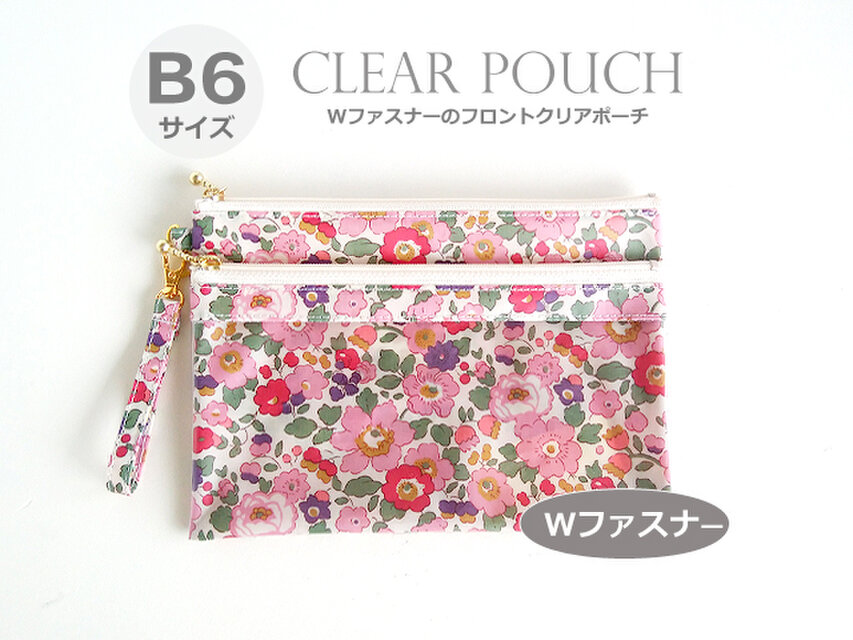 リバティの人気生地、(ビニールコーティングつや無)、ベッツィ Betsy (ピンク)で便利なWファスナーのフロントクリアポーチ(B6サイズ)を作りました。