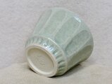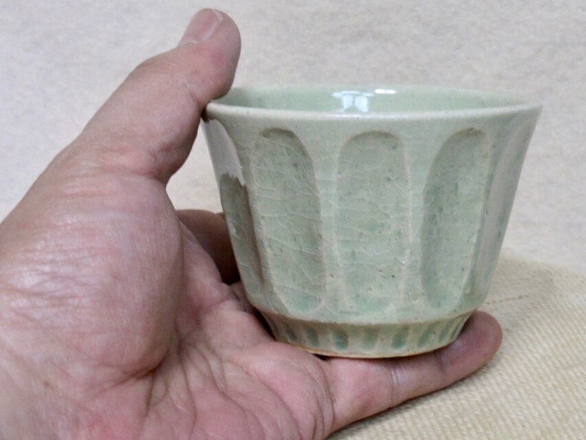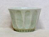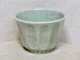 そば猪口やロックグラスに少し小さいかと感じる大きさのグラスです.手作業で「しのぎ」を削りました.荒いままの仕上げ面が丸見えになる薄い釉薬なので,いかにも手作りの味わいがあると思います.