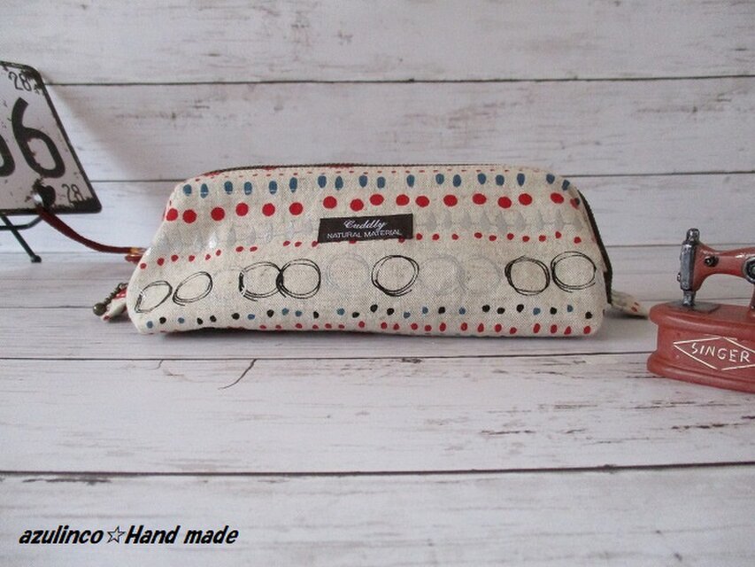 ワイヤー口金を使ったガバッと開くペンケースで生地はコットン×リネンのコロコロでペンケースを作りました。