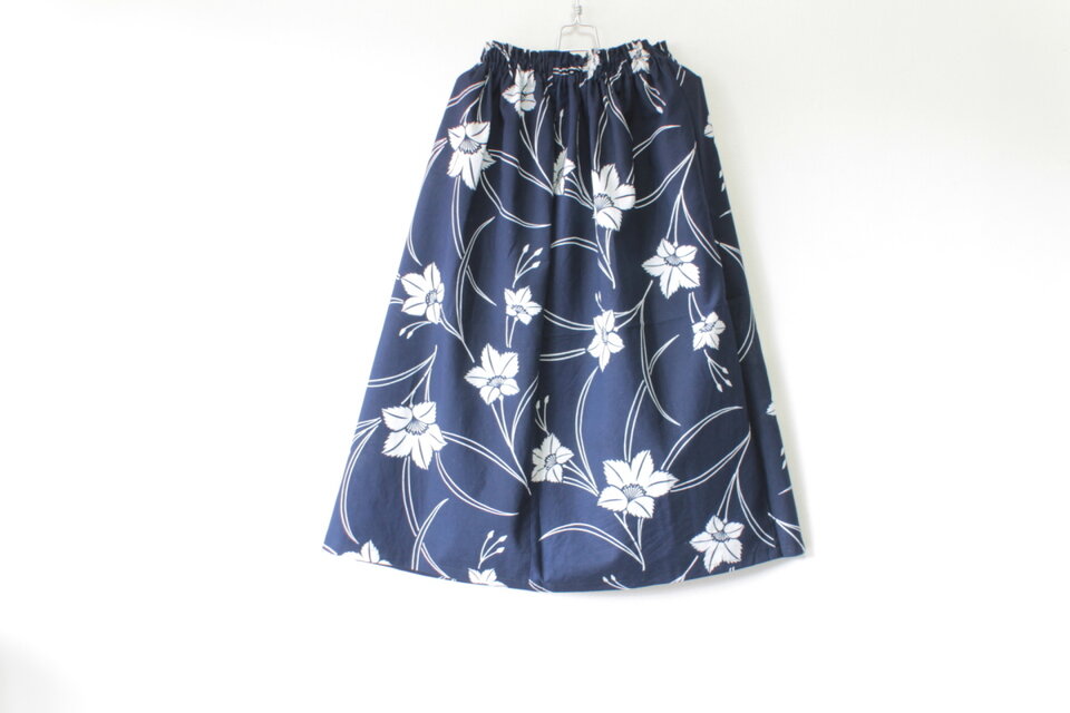 ・人気の紺地スカート、上品なナデシコ柄です。