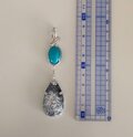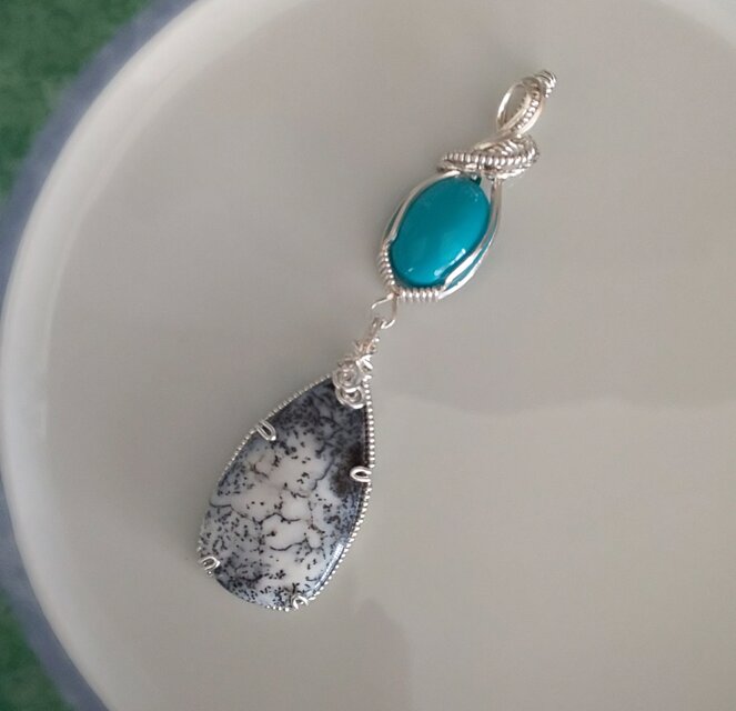 アリゾナ州 スリーピングビューティ産ターコイズとデンドリティックアゲートを繋いで揺れるタイプのペンダントトップを作りました。