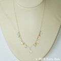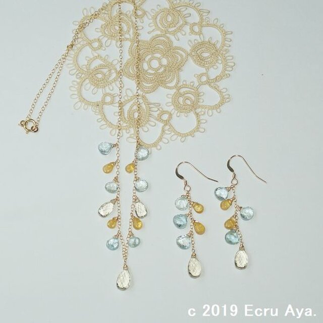 ネックレスチェーンには、宝石質アクアマリンAAA、宝石質ヘリオドール、極上カット宝石質スキャポライトAAA、宝石質アクアマリンAAA、宝石質ヘリオドールAAAと下げ、一番外側に宝石質アクアマリンAAAを下げています。