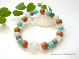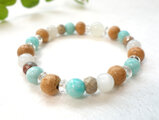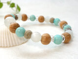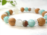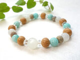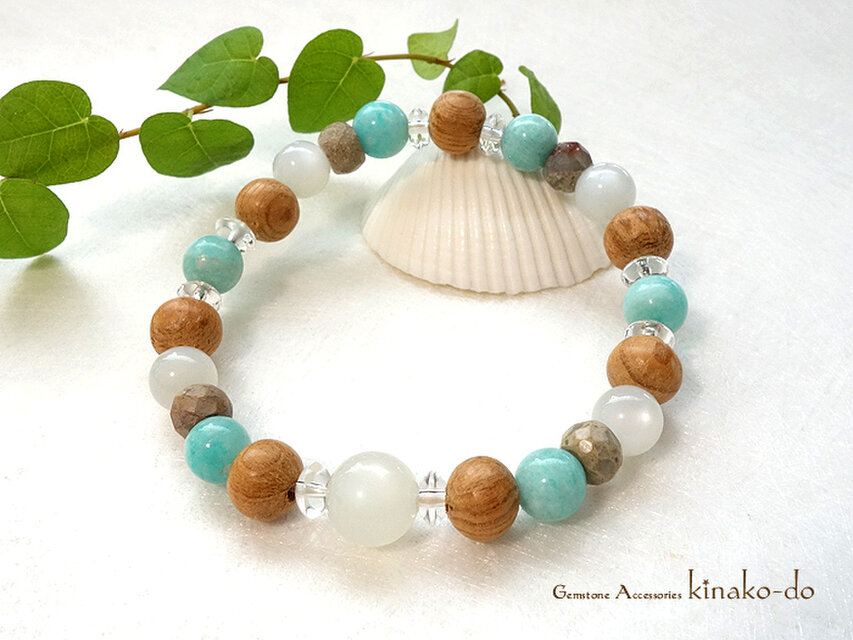 夜空で柔らかな光を放つ美しい月のような10mmの高品質ムーンストーンをメインに、爽やかなブルーグリーンに白い模様が浮かぶアマゾナイト、神秘的なシラーが浮かぶムーンストーンに屋久杉のビーズを組み合わせました。