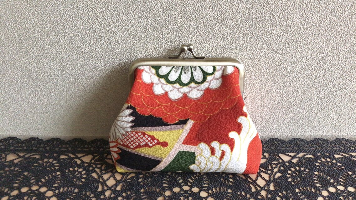 カラフルな子どもキモノ地を使ったがま口です。片面は華やかな柄、もう片面は疋田柄です。