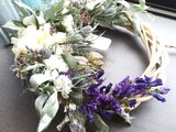 青みがかったシルバーカラーのエリンジュウムなどのシルバーカラーとパープルカラーとのナチュラルなリースです。