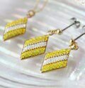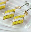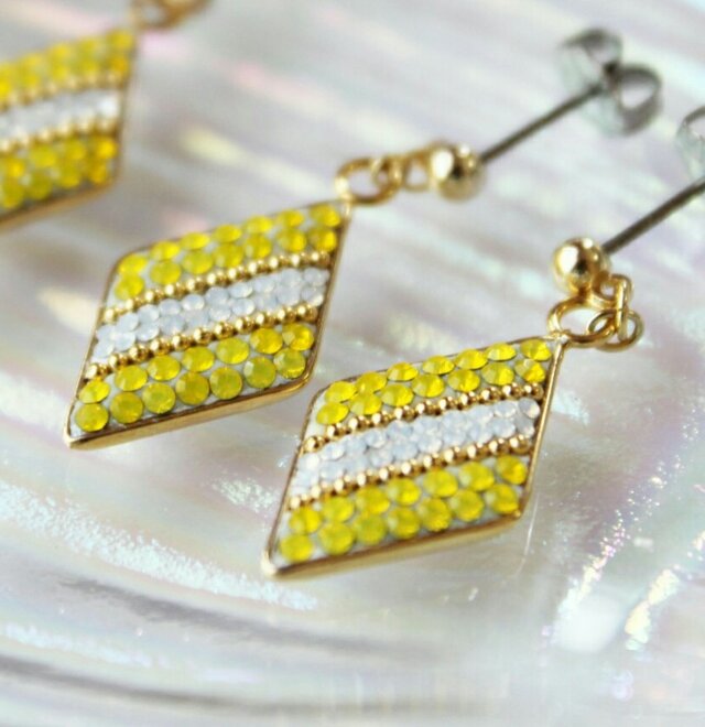 ゴールドのスクエア型の土台にレモンイエローとホワイトのスワロフスキー・クリスタルでストライプ柄を描いた、夏らしくて涼しい印象のダイヤ型のピアスです。