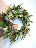 アナベル、柏葉あじさい、キンポウジュ、ふ、スターチスなどをアレンジしたナチュラルなリースです。