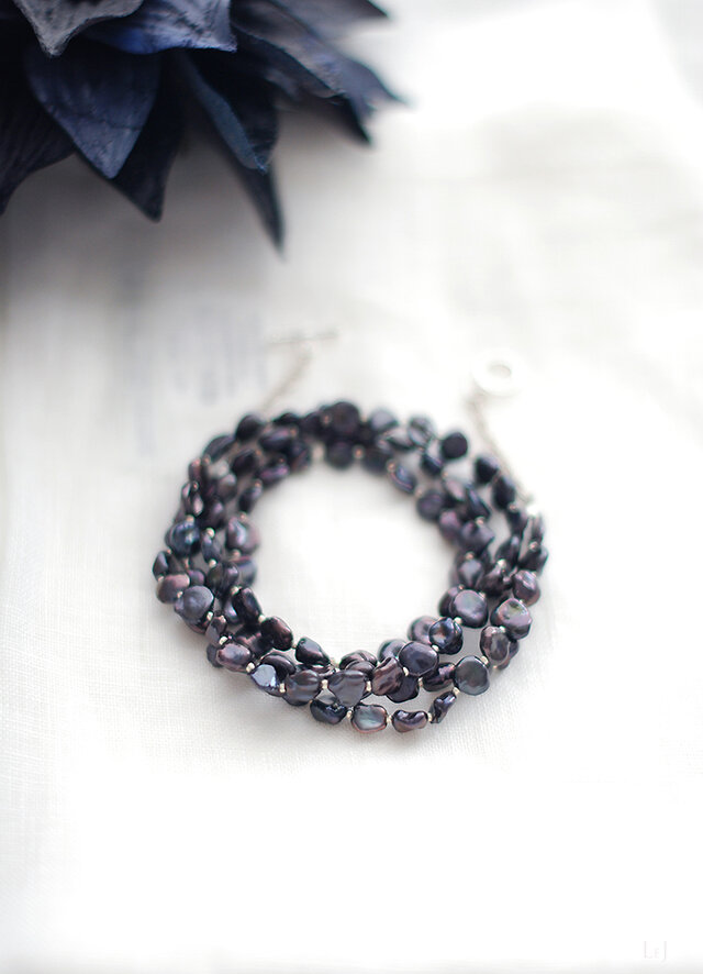 7×7mmのパールはとても表情ゆたか。シンプルな白いシャツとデニムに合わせても存在感はたっぷり。ベージュやホワイト、ブラック、ターコイズ色やパープル、レッド、グリーンとも合いそうです。留め具まわりにはチェーンを使って、ネックレスにしたときには留めやすく、ブレスレットにしたときにもおさまりが良いようにしました。間にはさんだパーツがネックレスのアールをきれいにする役割とちいさな光を添える効果を持っています。