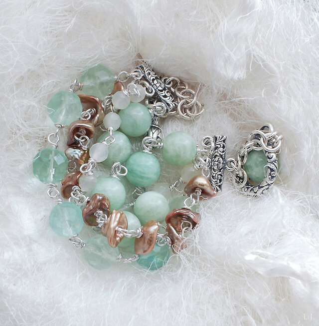 素材:グリーンオーソクレーズ・ホワイトムーンストーン・ケシパール・グリーンフローライト・シルバー925・アーティスティックワイヤー