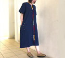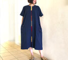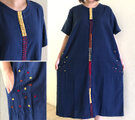 藍染め手織り綿、手挿し刺繍のゆったりワンピース、オールシーズン、ライン柄